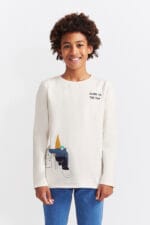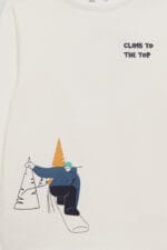 Camiseta blanca de manga larga para niño con divertido dibujo de snowboard y mensaje “Climb to the top”. Confeccionada en algodón suave, perfecta para el invierno.