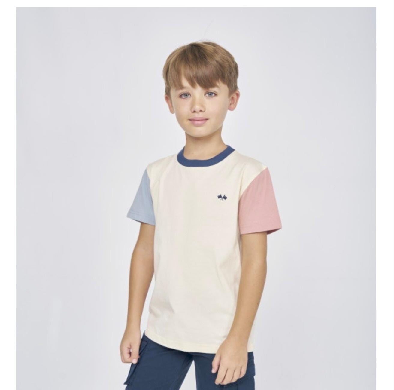 Camiseta de niño Spagnolo en color beige con mangas en contraste azul y rosa. Un diseño moderno y cómodo perfecto para el día a día.