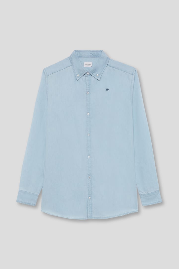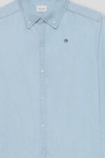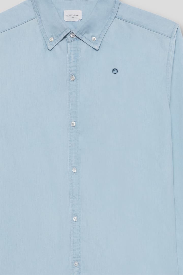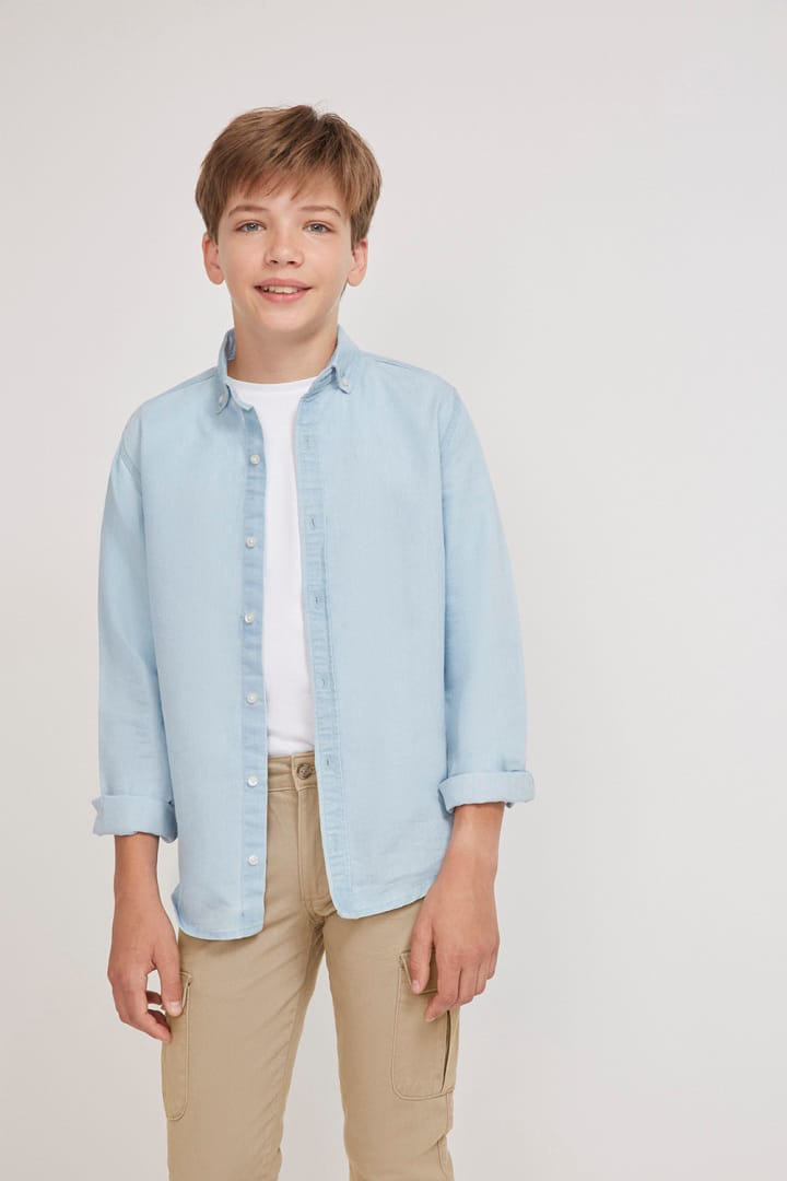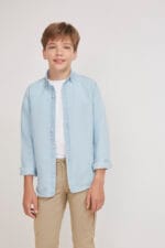 Camisa infantil en tono azul denim, de manga larga y tejido ligero. Un básico versátil y elegante para looks más arreglados o combinaciones casual.