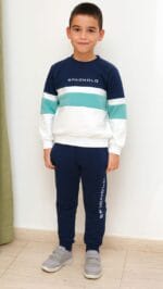 La sudadera presenta un diseño a rayas con franjas en azul marino, blanco y verde agua, y el logotipo de Spagnolo bordado en el pecho. El pantalón, en azul marino, cuenta con goma en la cintura, puños en los bajos y el logo vertical en la pierna.