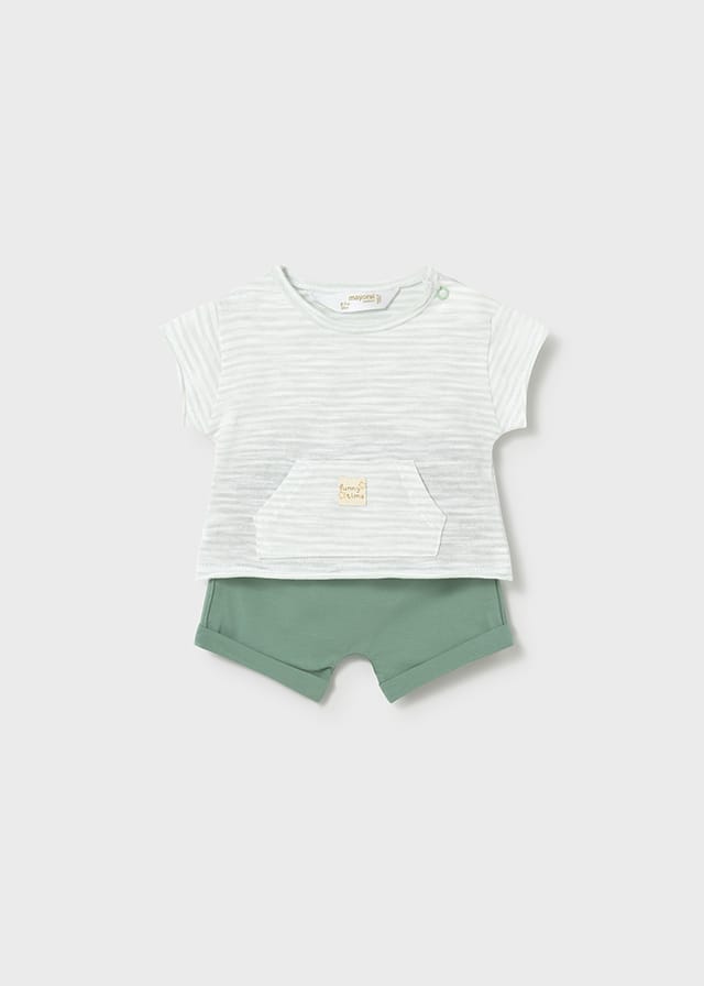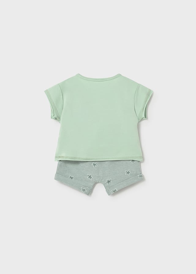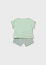 Conjunto de bebé Mayoral en tonos verdes con dos camisetas y dos pantalones cortos, cómodo y versátil.