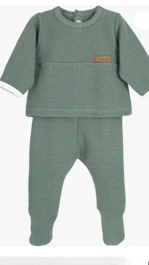 Conjunto de bebé niño con camiseta y polaina en canalé azul verdoso, suave y cómodo. Perfecto para otoño/invierno. Colección Céfiro de Calamaro.