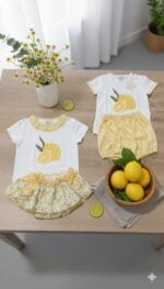 La camiseta presenta un bonito diseño de limón en la parte frontal, que aporta un toque alegre y veraniego. Las mangas incluyen un acabado en vichy amarillo que combina perfectamente con el short del conjunto.