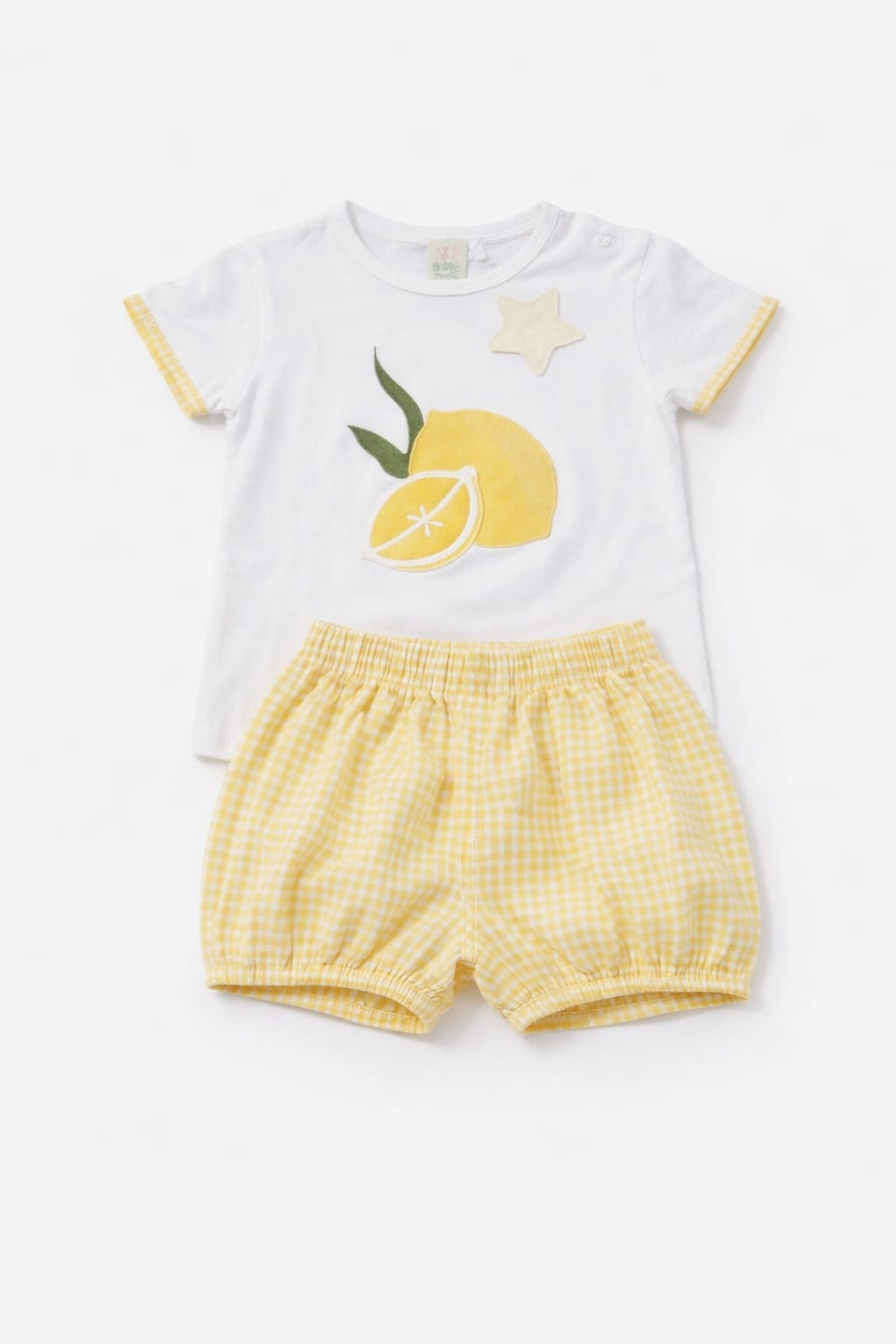 Conjunto de bebé niño compuesto por camiseta blanca con dibujo de limón y short en cuadro vichy amarillo. Un look fresco y cómodo ideal para el verano.