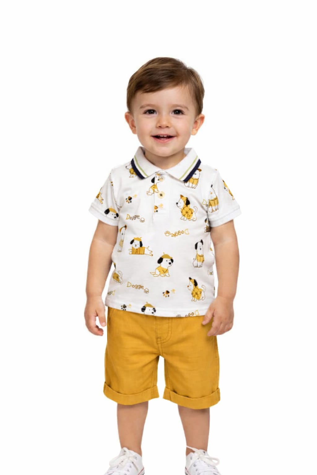 Este conjunto de bebé para niño es perfecto para el día a día y para ocasiones especiales durante los meses más cálidos. Está compuesto por un polo de manga corta en color claro con estampado de perritos, cuello camisero y botones frontales, que aportan un toque clásico y muy dulce.
