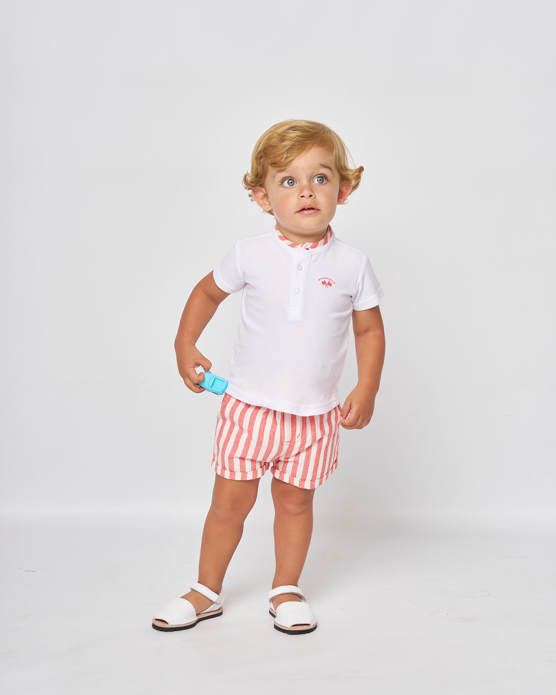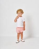 Conjunto de bebé Spagnolo con polo blanco y short de rayas rojo, fresco y elegante para verano.