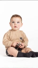 Conjunto de niño bebé compuesto por jersey de punto y bombacho de cuadros, de la colección Tramontana de Calamaro. Disponible desde la talla 1 hasta 36 meses.
