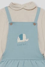 Conjunto para bebé compuesto por dos piezas de la marca Street Monkey. Incluye una blusa de manga larga en color crudo con cuello redondo y una ranita de peto en tono azul safari, con un divertido estampado de elefante y botones decorativos de madera. Fabricado en algodón suave y cómodo para la piel del bebé. Ideal para los meses más frescos, combinando estilo y confort en una sola prenda.