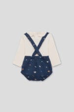 Conjunto bebé con tirantes en azul marino, con camiseta de algodón y braguita con estampado animal. Diseño cómodo y divertido de Street Monkey.