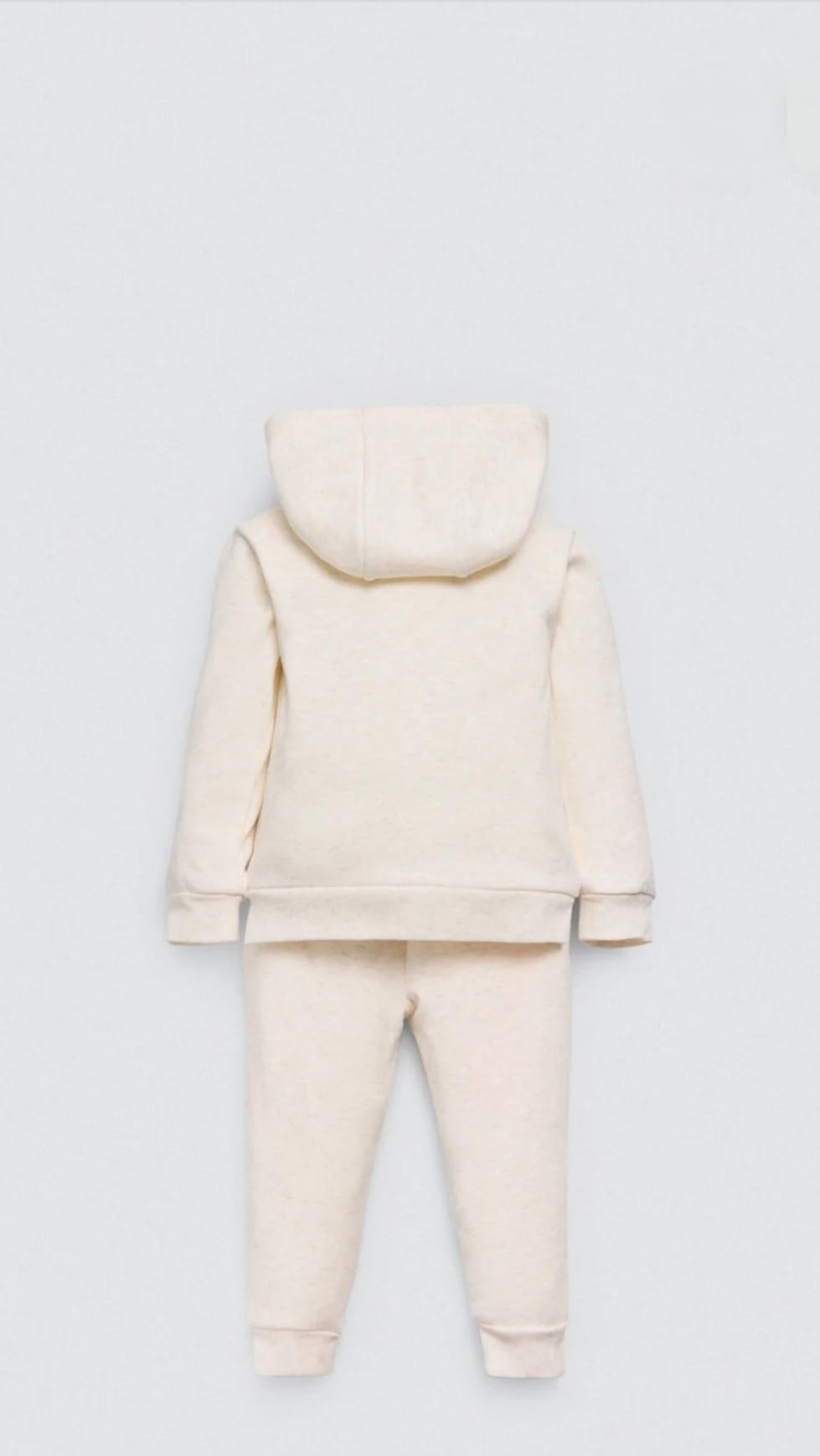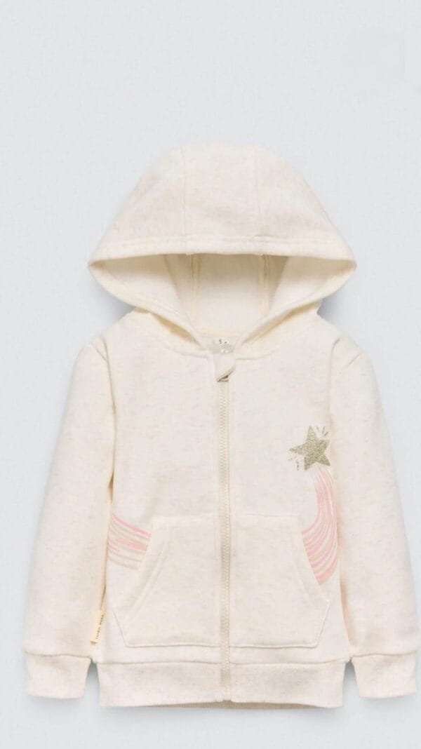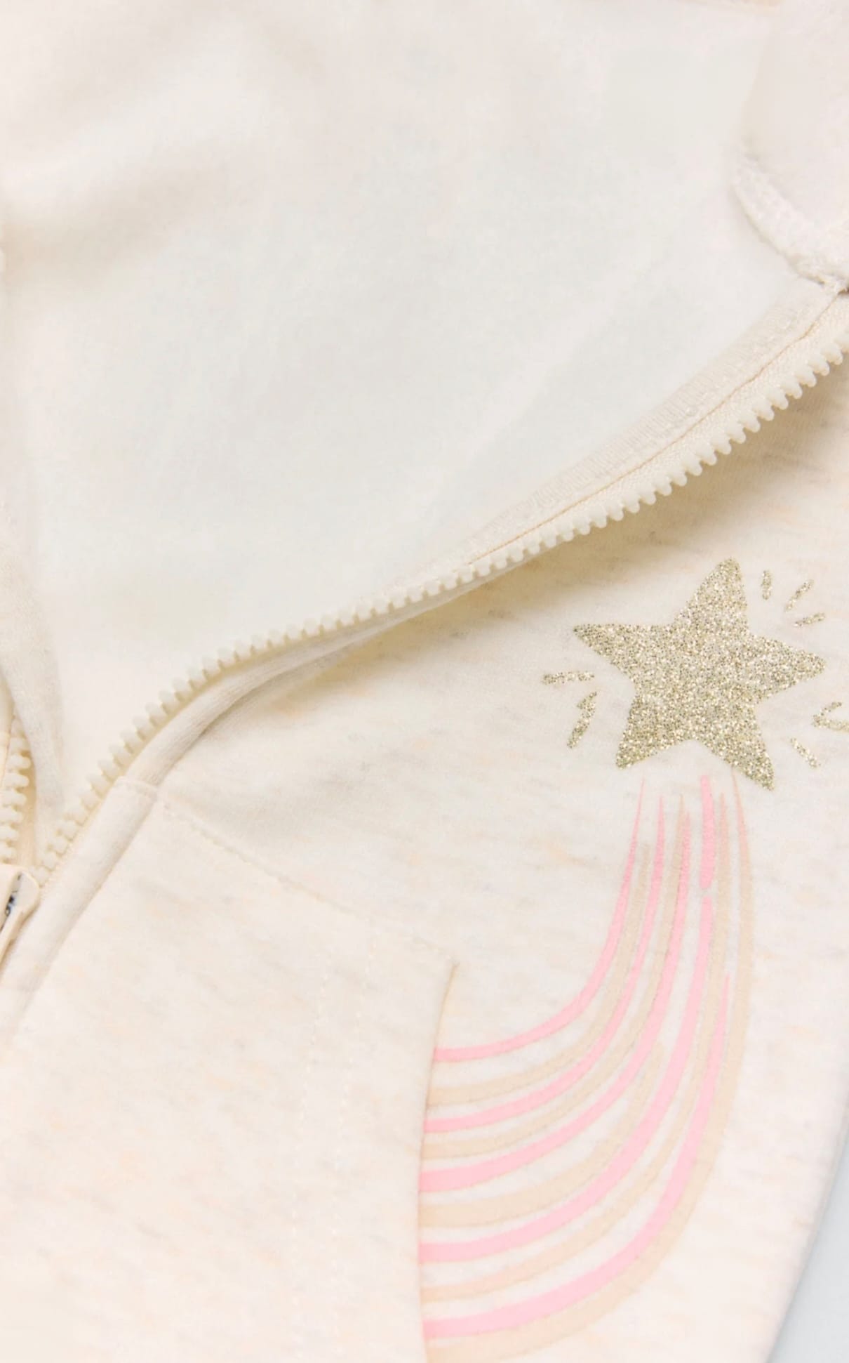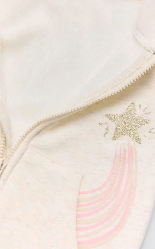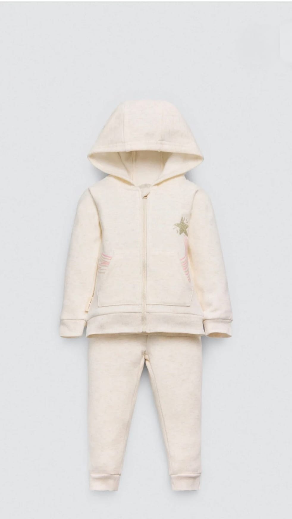 Incluye sudadera con capucha, cremallera y detalle glitter de estrella en el pecho. El pantalón tiene cinturilla fruncida con lacito rosa decorativo, bajo con puño y tejido suave y cómodo.