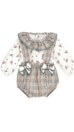Conjunto para bebé niña de la colección Chamsin de Calamaro, con body floral y bombacho de cuadros con tirantes. Disponible de la talla 1 a 36 meses.