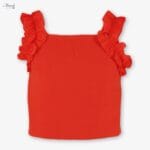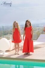 Conjunto de niña Miranda Ref. 303 compuesto por top con volantes y pantalón largo fluido en color rojo. Ideal para eventos, celebraciones y ocasiones especiales.
