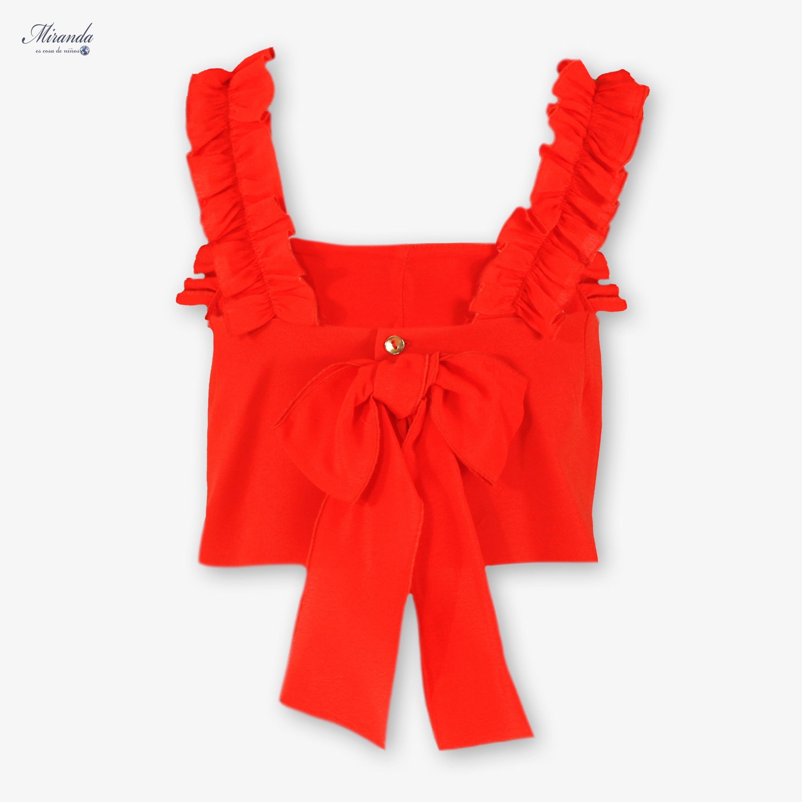 El top, en un intenso color rojo, presenta un diseño de tirantes con volantes que aportan volumen y un acabado femenino y sofisticado. En la parte trasera destaca un gran lazo decorativo que realza el diseño y añade un toque especial y distintivo al conjunto.