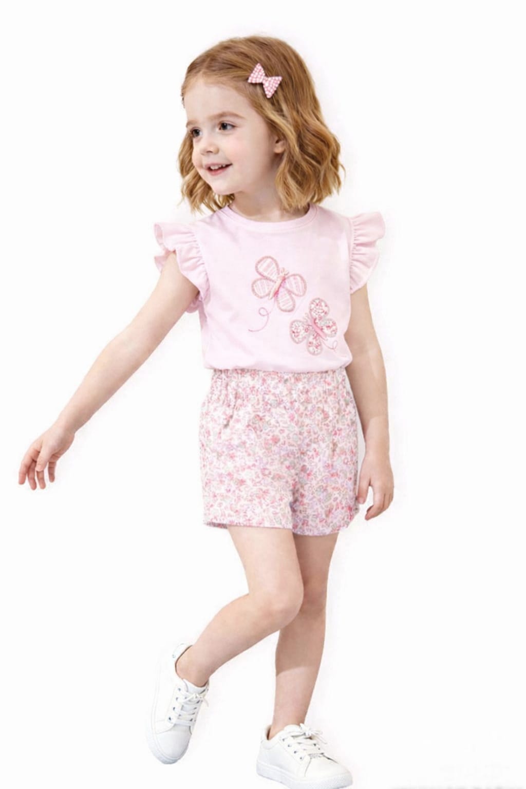 Conjunto infantil de niña en tonos rosas, formado por camiseta con volantes y short estampado. Cómodo, fresco y perfecto para el día a día en primavera y verano.