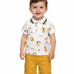 Conjunto de niña ideal para los meses más cálidos, compuesto por una camiseta rosa de manga corta con delicados volantes en los hombros y un bonito detalle decorativo en el frontal. Se combina con un short estampado en tonos suaves, con cintura elástica que aporta comodidad y libertad de movimiento.
