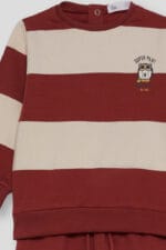 Conjunto infantil de dos piezas para niño, compuesto por sudadera de rayas granates y crudas con dibujo de osito piloto y pantalón a juego. ¡Perfecto para el día a día!