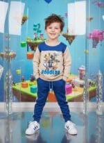 Conjunto de sudadera y pantalón para niño en tejido de felpa cardada con pelo, súper calentito y cómodo. Diseño Brainrot en tonos azul jeans y beige. Ideal para el día a día.