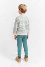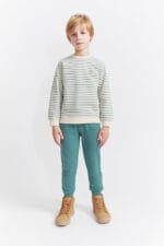 Conjunto para niño de la marca Street Monkey, compuesto por sudadera de felpa en color crudo con finas rayas verde agua y divertido dibujo de erizo con el texto «Little Hedgehog». El pantalón, a juego en verde agua, tiene cinturilla elástica con cordón ajustable y bolsillos laterales. Una opción cómoda y práctica para el uso diario, sin renunciar al estilo. Perfecto para esta temporada.