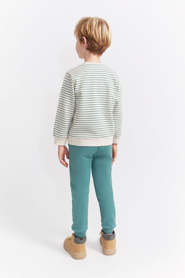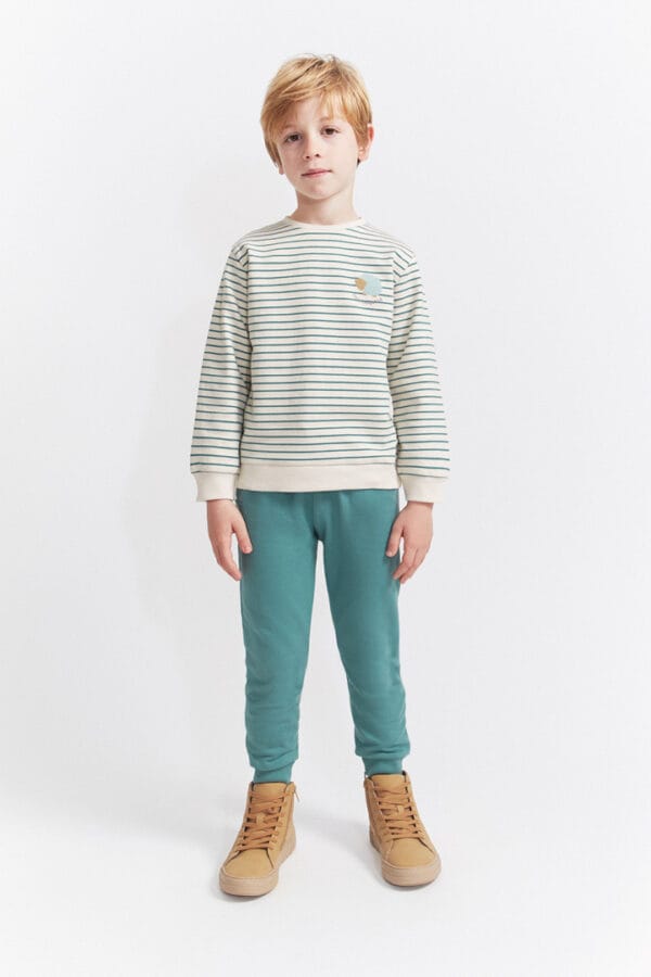 Conjunto para niño de la marca Street Monkey con sudadera de rayas crudo y verde agua, y pantalón a juego. Diseño cómodo y alegre con dibujo de erizo en el pecho. ¡Ideal para el día a día!