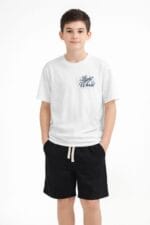 Conjunto juvenil para niño compuesto por camiseta blanca con estampado “Light World” y bermuda negra. Un look moderno, cómodo y fácil de combinar para el día a día.