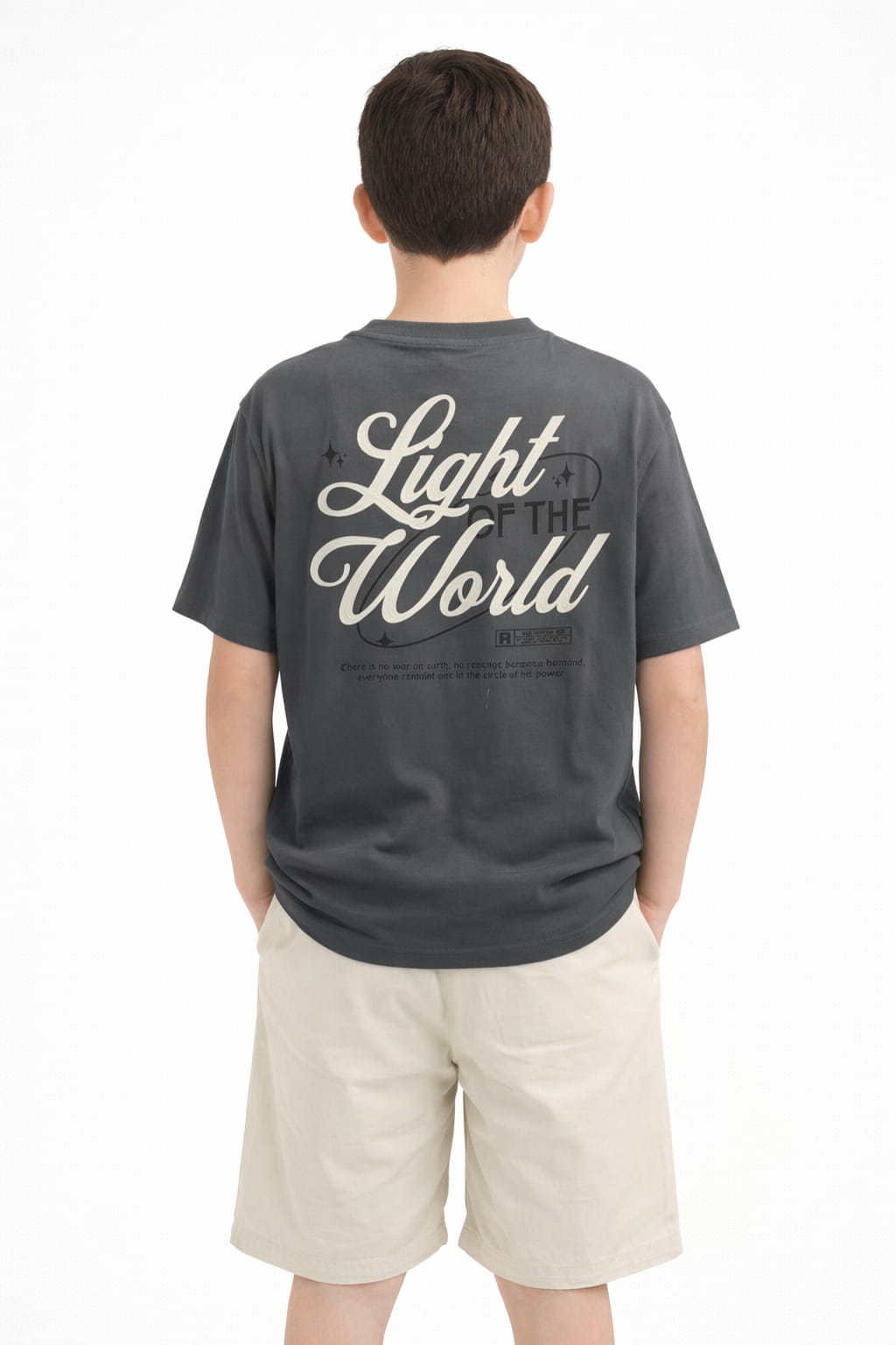 Conjunto juvenil de niño ideal para la temporada primavera-verano, formado por camiseta en tono gris oscuro con estampado delantero y trasero “Light World”, que aporta un estilo actual y urbano.
