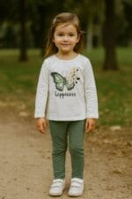 Conjunto de niña compuesto por camiseta blanca de manga larga con un bonito dibujo de mariposa verde y flores acompañada del mensaje “Happiness”, y leggings en tono verde suave.