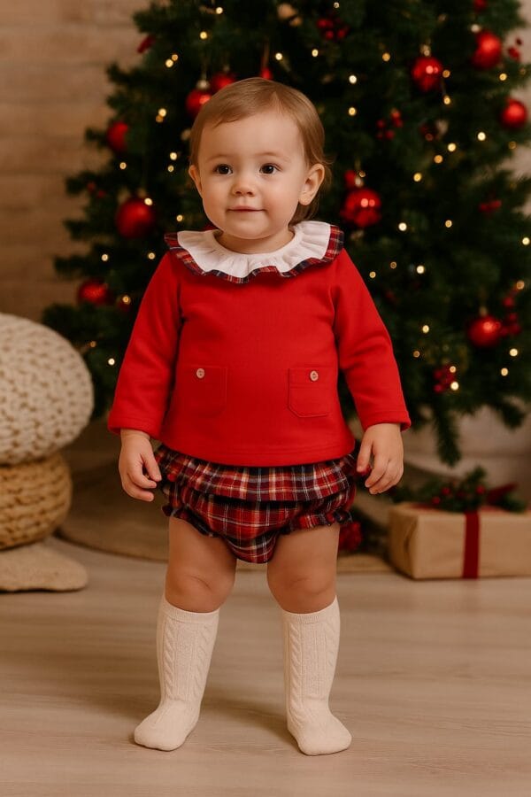 Conjunto navideño para bebé niña de BabyFer: blusa roja con cuello volante y falda con braguita de cuadros. Un look clásico y encantador para estas fiestas.