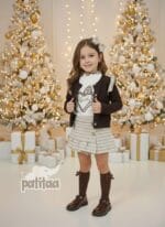 Conjunto de tres piezas para niña compuesto por chaqueta de felpa cardada, camiseta polar con aplicación bordada y falda pantalón en tejido jacquard beige. Un look ideal para eventos y Navidad.