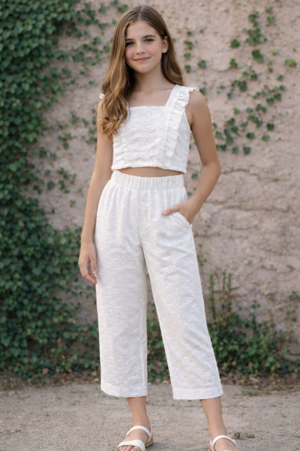 Conjunto infantil de niña formado por top corto de tirantes y pantalón largo de pierna recta, confeccionados en tejido ligero con bordado decorativo en color blanco.