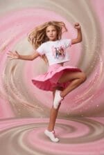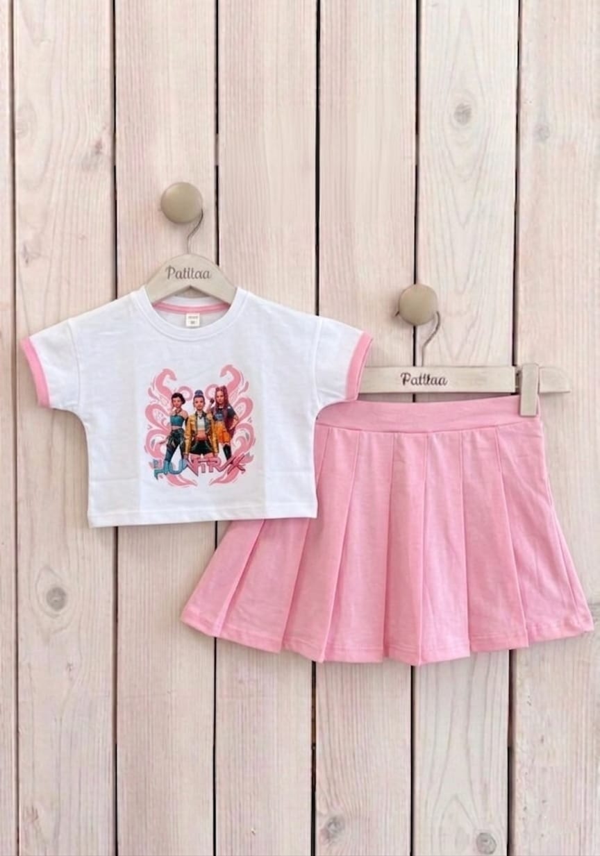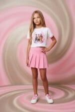 Conjunto de niña con camiseta corta blanca estampada y falda pantalón rosa. Cómodo, práctico y con mucho estilo para el día a día.