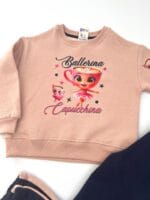 Una sudadera rosa empolvado con estampado de “Capucchina”, una encantadora taza de café con tutú de bailarina, acompañada de estrellitas y detalles brillantes.