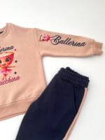 Conjunto para niña de dos piezas, con sudadera rosa empolvado con diseño de Capucchina bailarina y pantalón marino con detalle rosa. Original y cómodo.