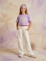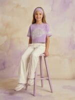 Conjunto cómodo y actual para niña en tono lila con pantalón blanco de corte recto. Ideal para looks diarios con un toque moderno y juvenil.