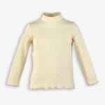 Conjunto de niña de Miranda formado por una falda-pantalón de cuadros en tonos marino, beige y gris con detalle de lazada lateral, combinada con una camiseta beige de canalé con cuello semi alto y acabado ondulado.