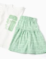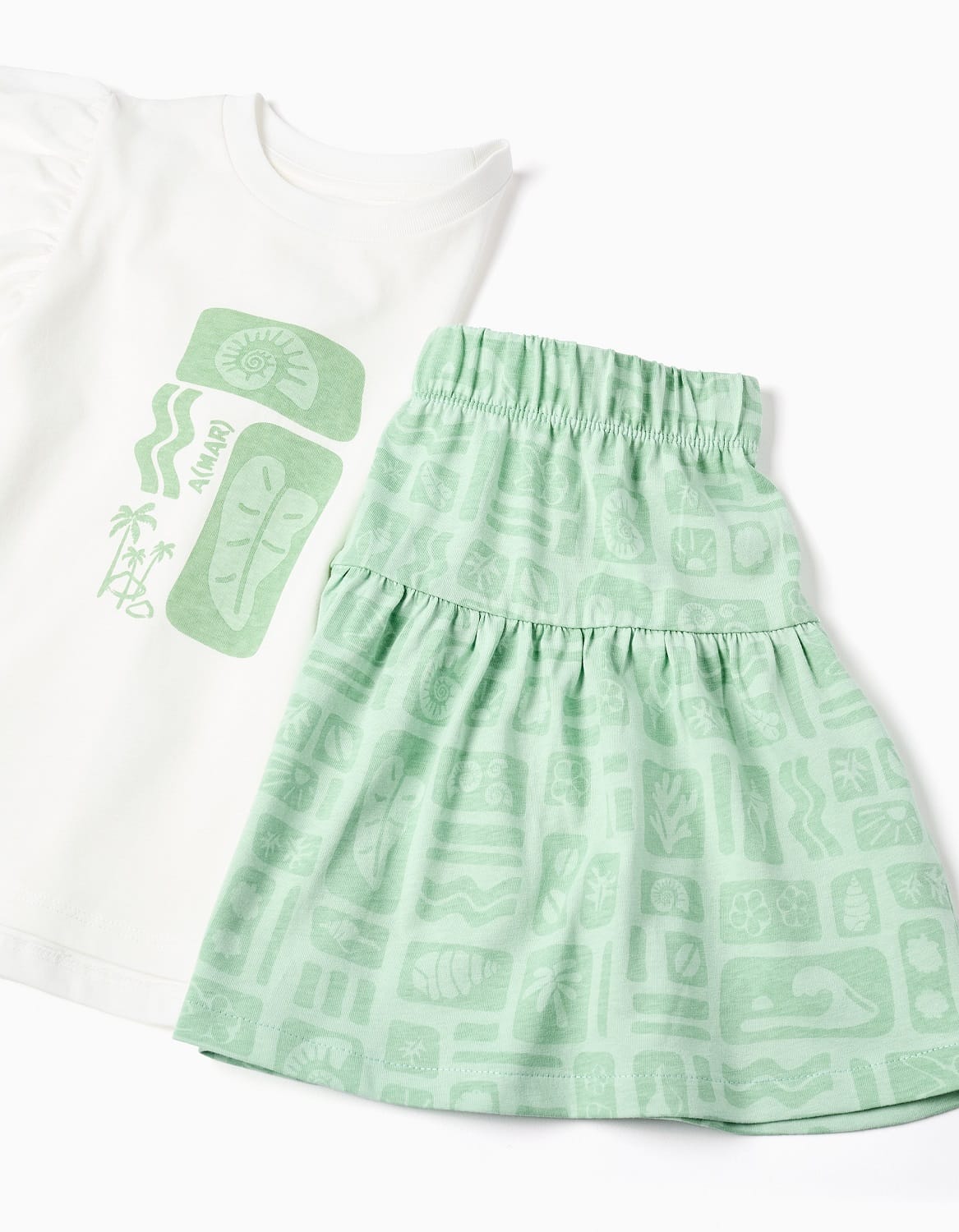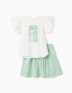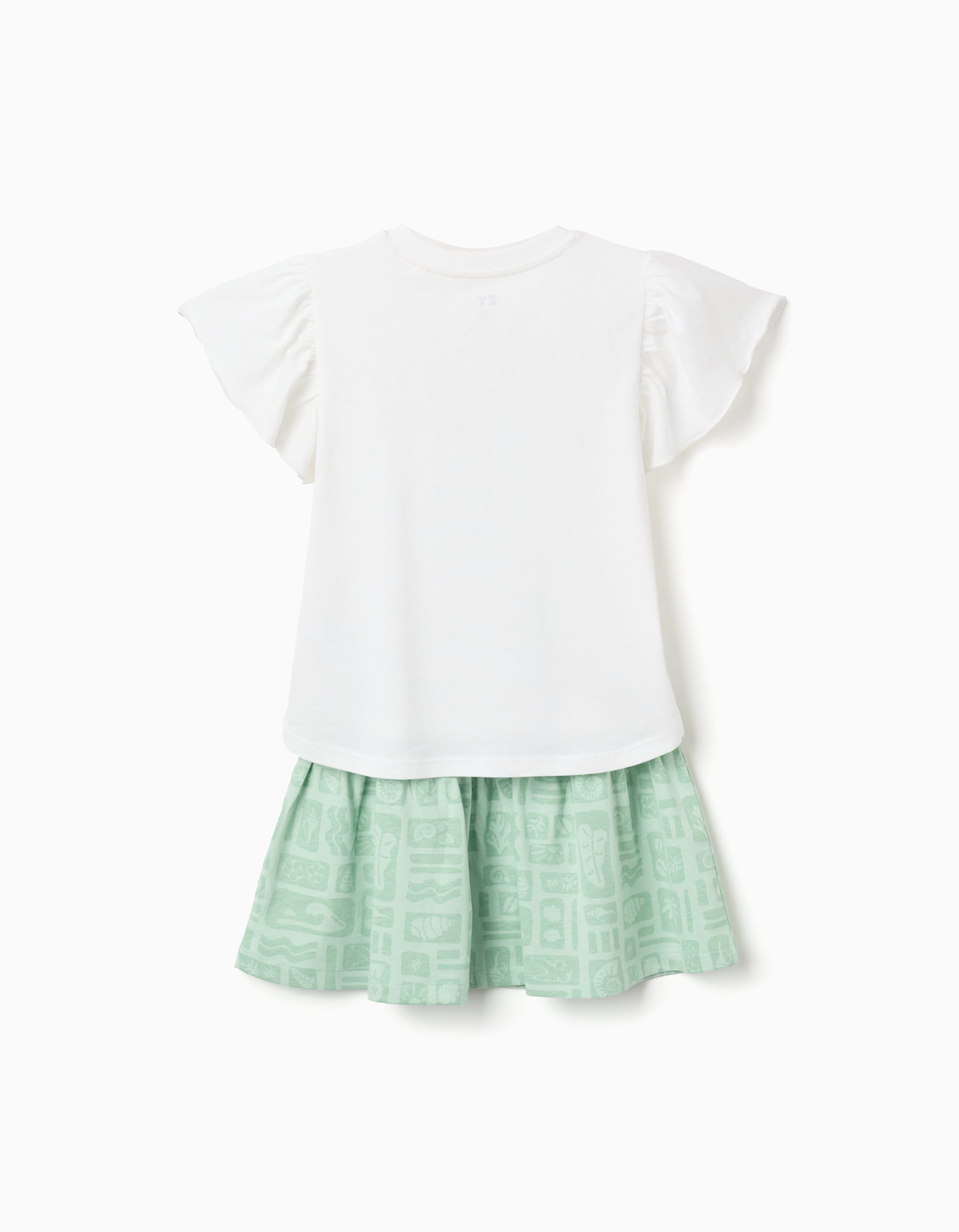 Conjunto para niña compuesto por camiseta blanca con volante en las mangas y falda verde estampada. Un conjunto cómodo, fresco y perfecto para los días de verano.