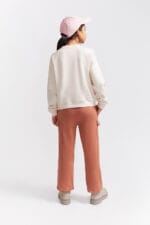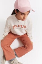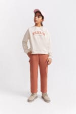 Conjunto para niña compuesto por sudadera color crudo con texto «Fleur des Champs» y pantalón tipo cargo en tono tinto. Ideal para otoño e invierno.