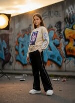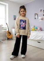 Conjunto para niña estilo KPOP con sudadera beige estampada y pantalón negro acampanado. Moderno, cómodo y con mucho estilo urbano.