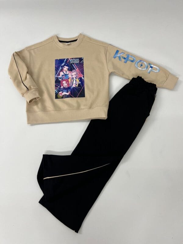 Conjunto para niña estilo KPOP con sudadera beige estampada y pantalón negro acampanado. Moderno, cómodo y con mucho estilo urbano.