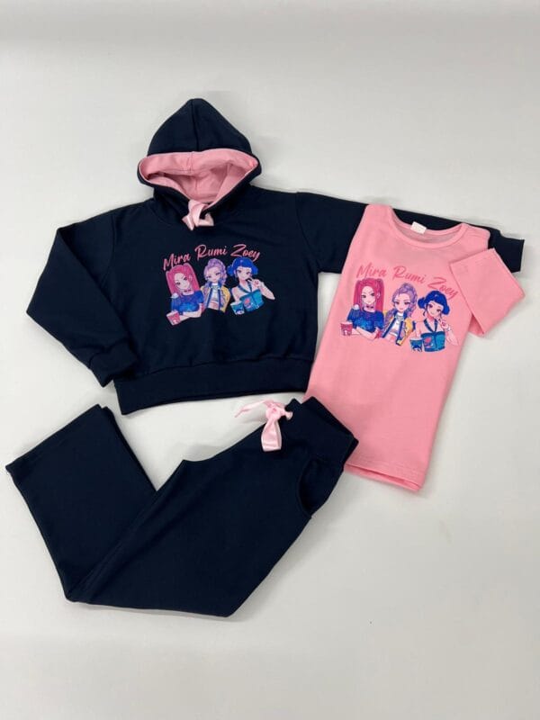 Conjunto de 3 piezas para niña estilo KPOP, con sudadera marino, camiseta rosa y pantalón a juego. Moderno, cómodo y lleno de estilo urbano.