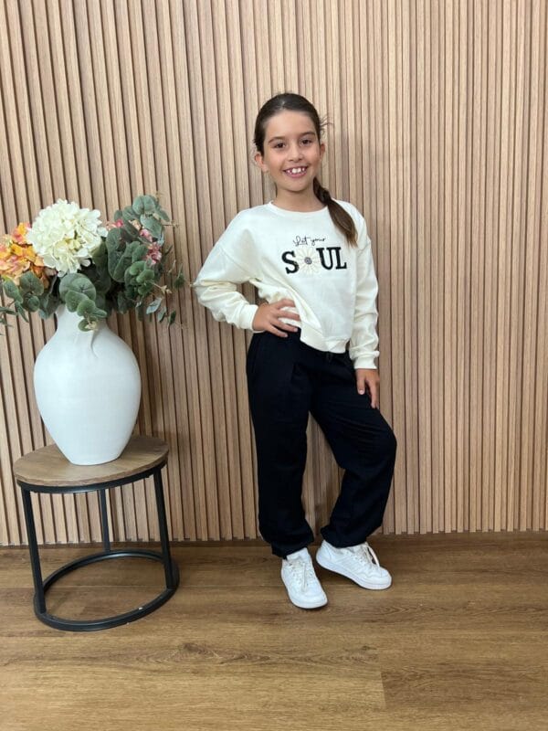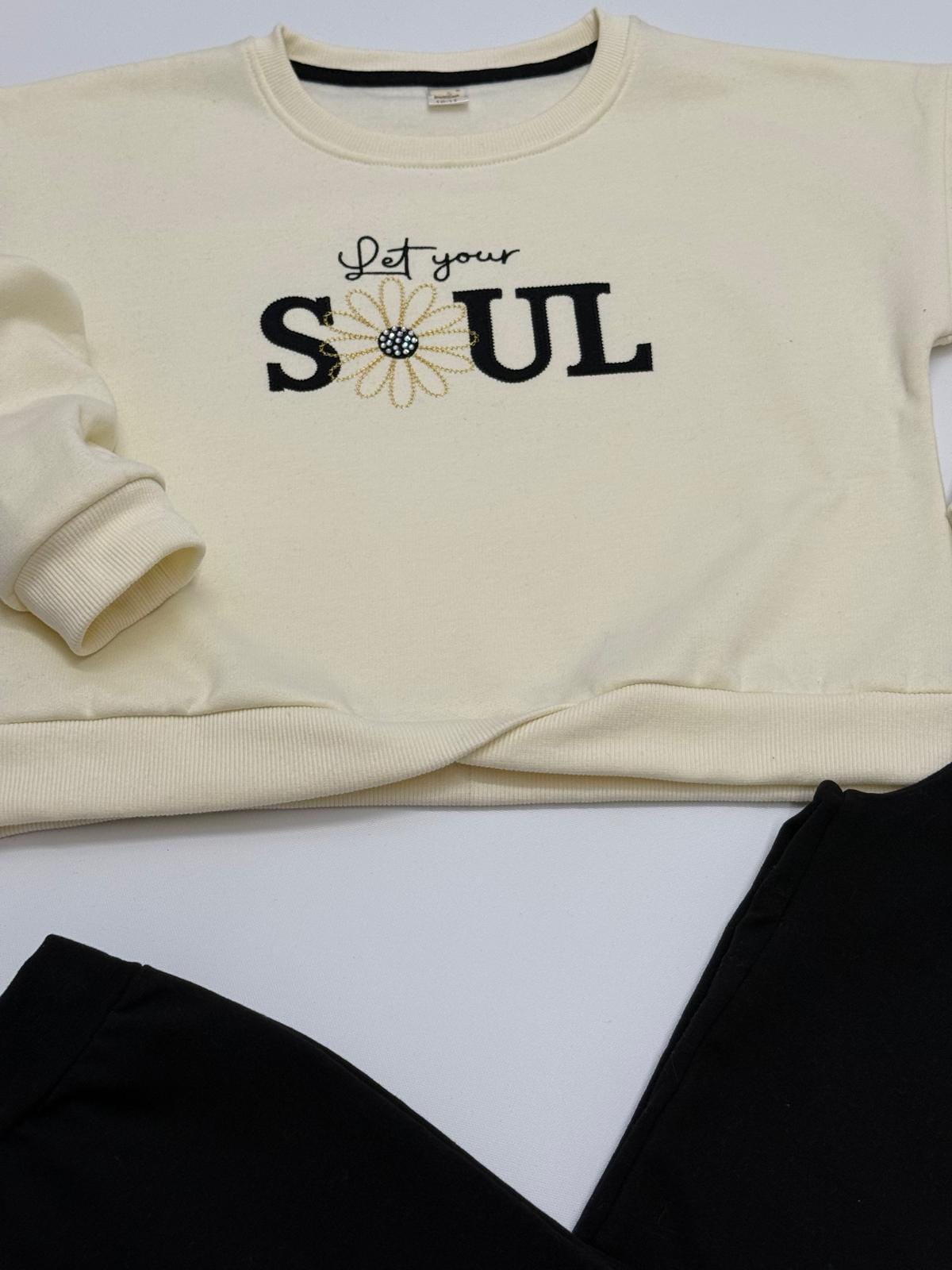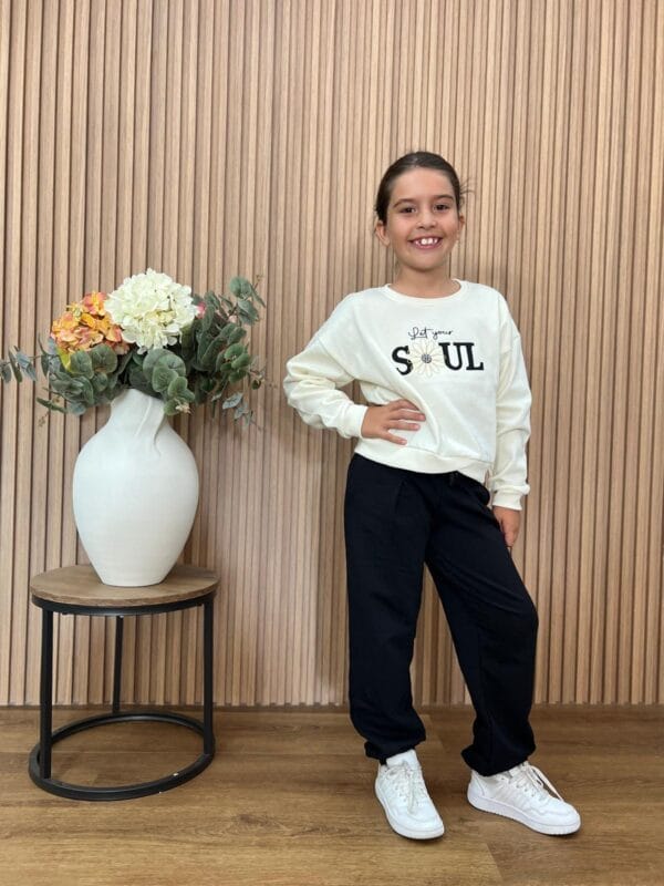 Conjunto de sudadera beige con mensaje «Let your soul» y pantalón negro. Cómodo, moderno y con un toque inspirador para el día a día.