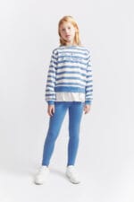 Conjunto de niña compuesto por sudadera de manga larga con estampado de rayas en azul medio y blanco, decorada con la palabra «Nature» en relieve en la parte delantera. El bajo incorpora un volante blanco que simula una camisa, dando un efecto dos piezas muy actual.