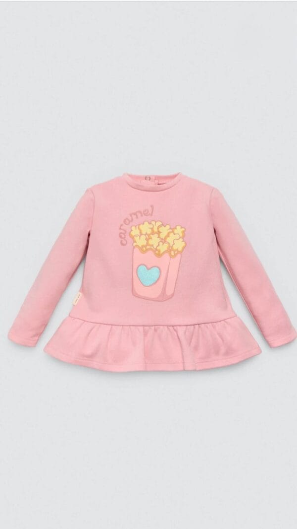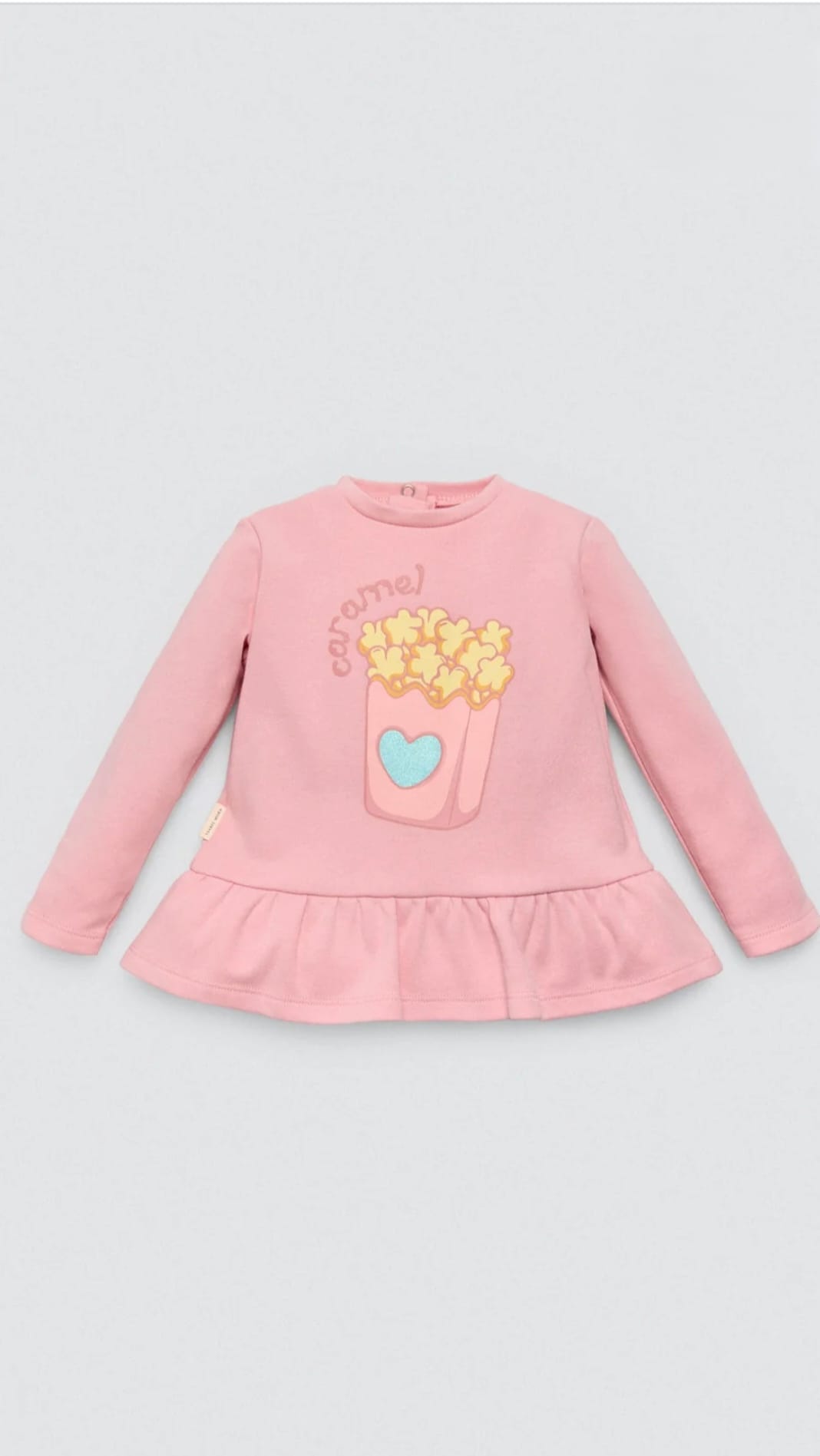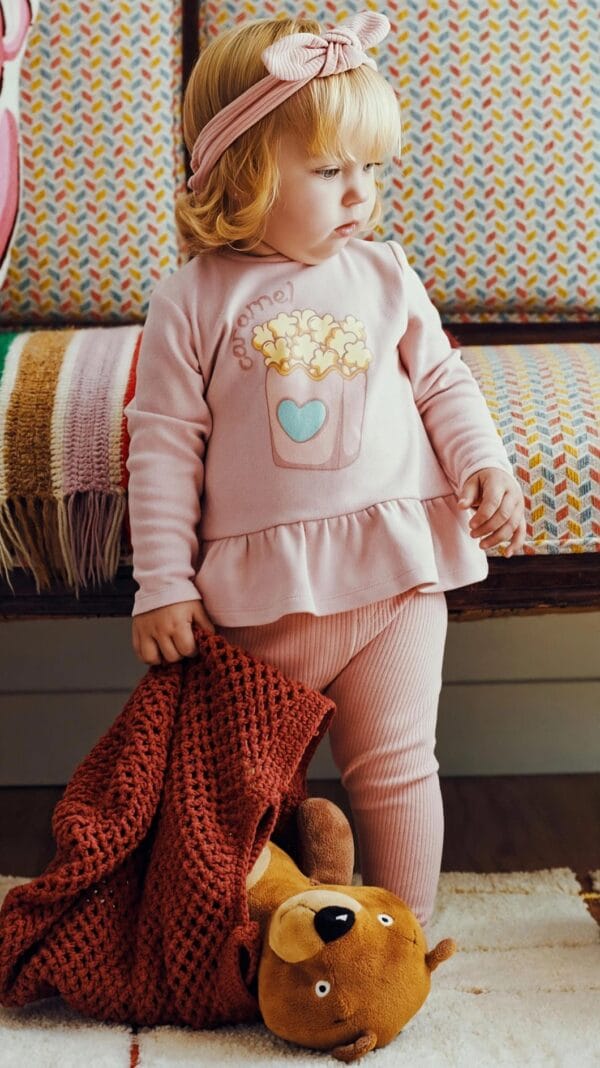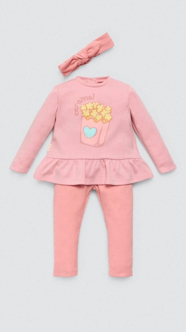 Conjunto infantil de niña de la marca Isabel Mora, ideal para los días de otoño e invierno. Incluye una sudadera rosa con bajo de volante, estampado de palomitas y detalle de glitter en el corazón, combinada con unos leggings canalé en el mismo tono. Se completa con una diadema de punto a juego, aportando un toque muy dulce y cómodo para el día a día.