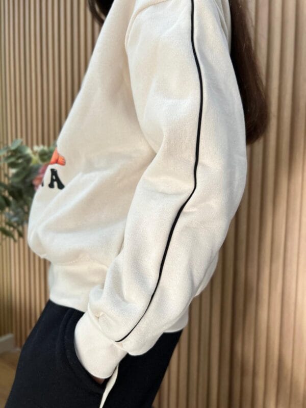 La sudadera blanca tiene un divertido estampado de Stitch y Lilo con la palabra “ALOHA”, ideal para fans del personaje.