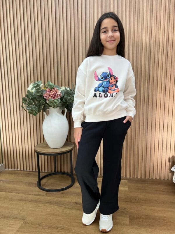 Conjunto de sudadera blanca con diseño de Stitch y pantalón ancho negro con línea decorativa. Estilo cómodo y moderno para niñas con personalidad.