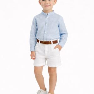 Conjunto de niño de la marca Babyfer compuesto por camisa blanca de manga larga con cuello mao y bermuda en tono beige con cinturón incluido.