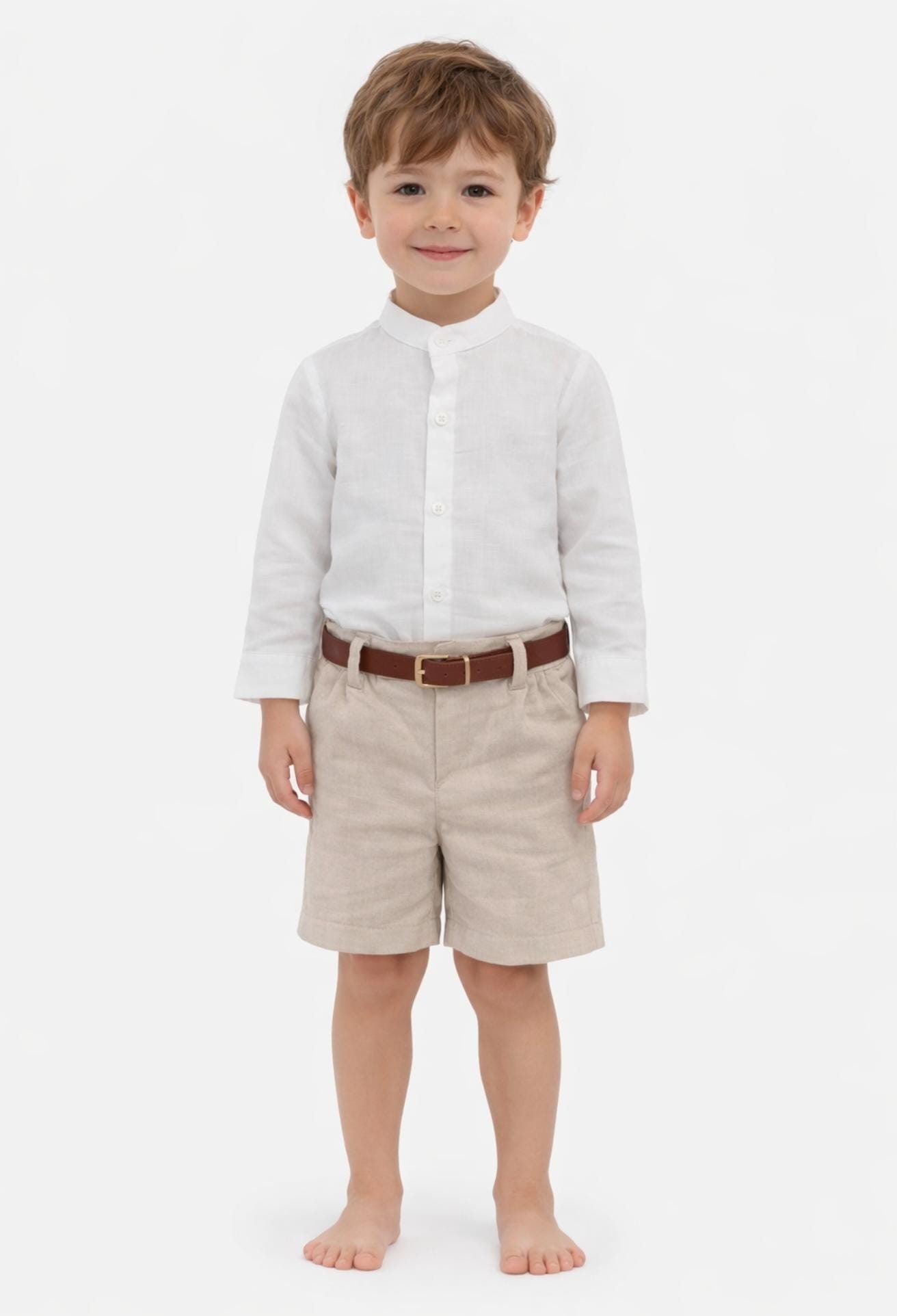 Conjunto elegante para niño con camisa blanca y bermuda beige con cinturón. Ideal para ocasiones especiales y looks de verano.