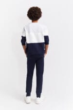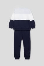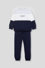 Conjunto de niño con sudadera de felpa perchada en bloques de color azul marino, blanco y gris vigoré. Lleva mensaje central “Living the dream – STMK Vibes” y puños acanalados. El pantalón a juego, también en azul marino, incluye cinturilla elástica con cordón ajustable y bolsillos laterales. Perfecto para el invierno gracias a su interior suave y calentito.