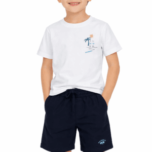 La camiseta blanca destaca por su diseño frontal con el logo clásico de la marca, aportando un toque elegante y reconocible. Se combina con una bermuda en tono verde oscuro tipo cargo, con bolsillos laterales que le dan un aire más desenfadado y práctico.