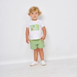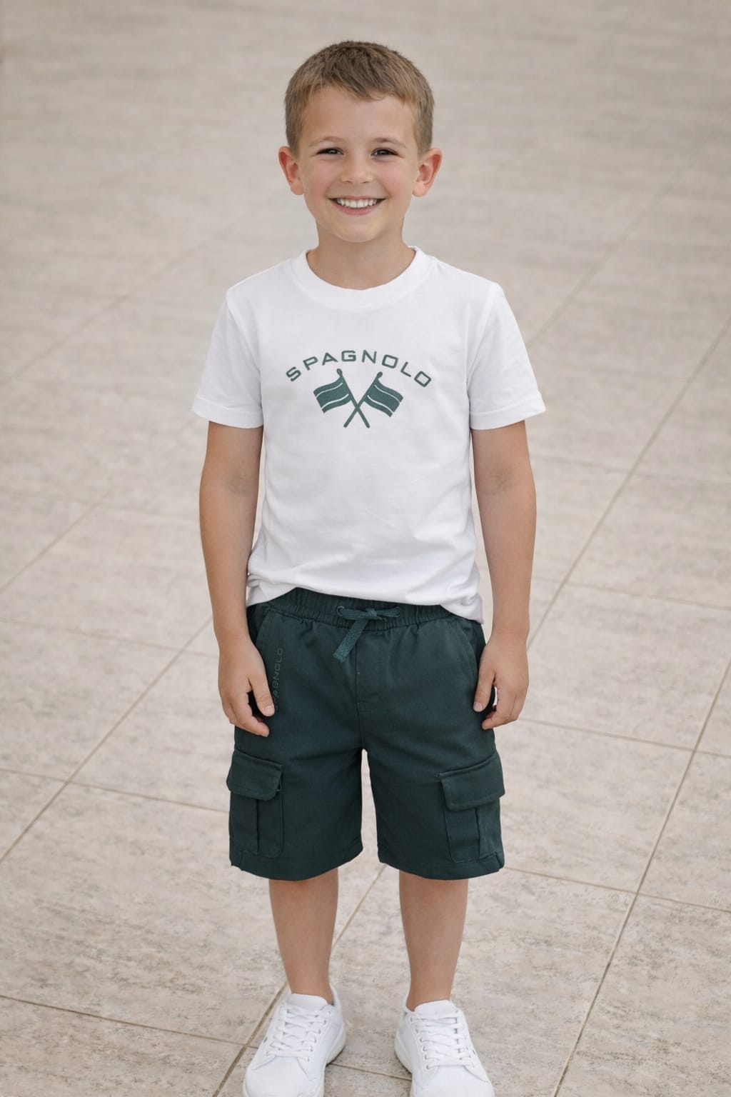 Conjunto de niño Spagnolo con camiseta blanca y bermuda verde estilo cargo, cómodo y moderno.