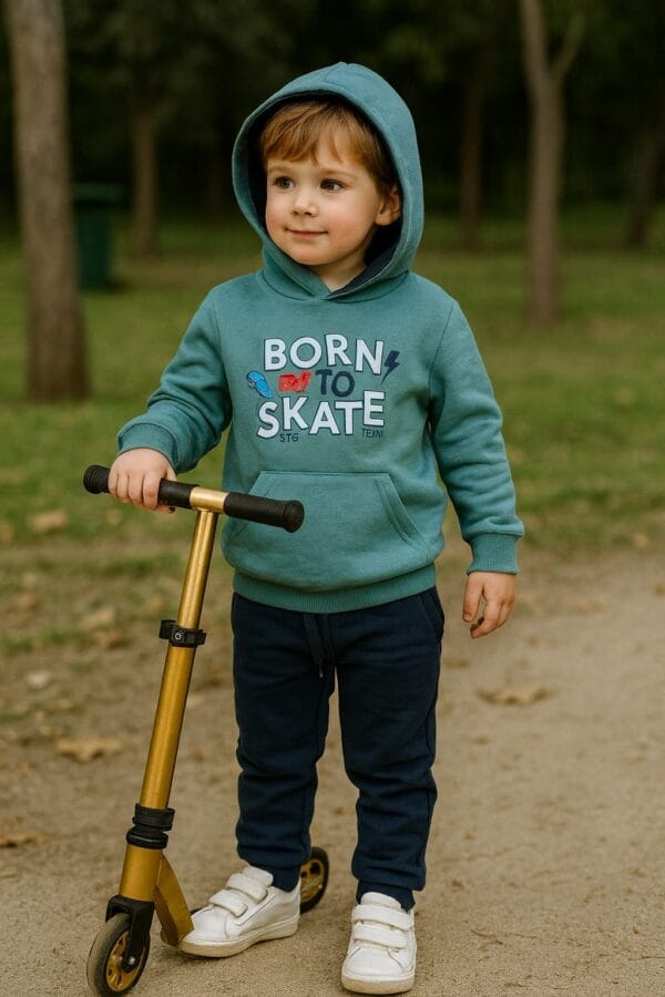 Conjunto de niño formado por sudadera con capucha en color verde con estampado frontal “Born to Skate”, y pantalón de felpa azul marino con cintura elástica y cordón ajustable.